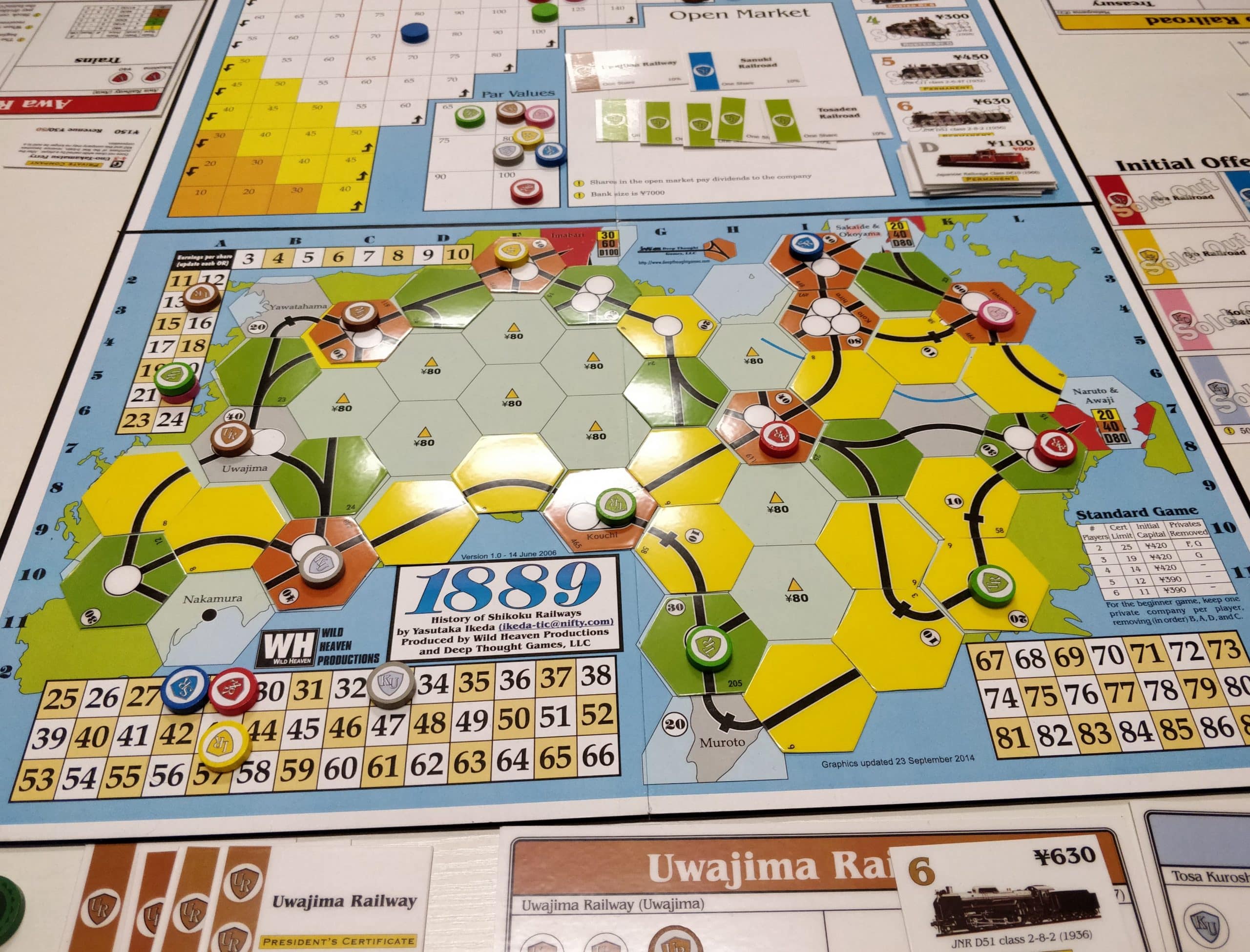 Table 3 : dans la série des 18xx, Manu après 1846 a amené 1889: History of Shikoku Railways qui se passe vous l’aurez deviné au Japon. Nos cinq ludophiles tycoon de la partie sont Christophe, Fred, Guillaume, Manu et Sylvain D.