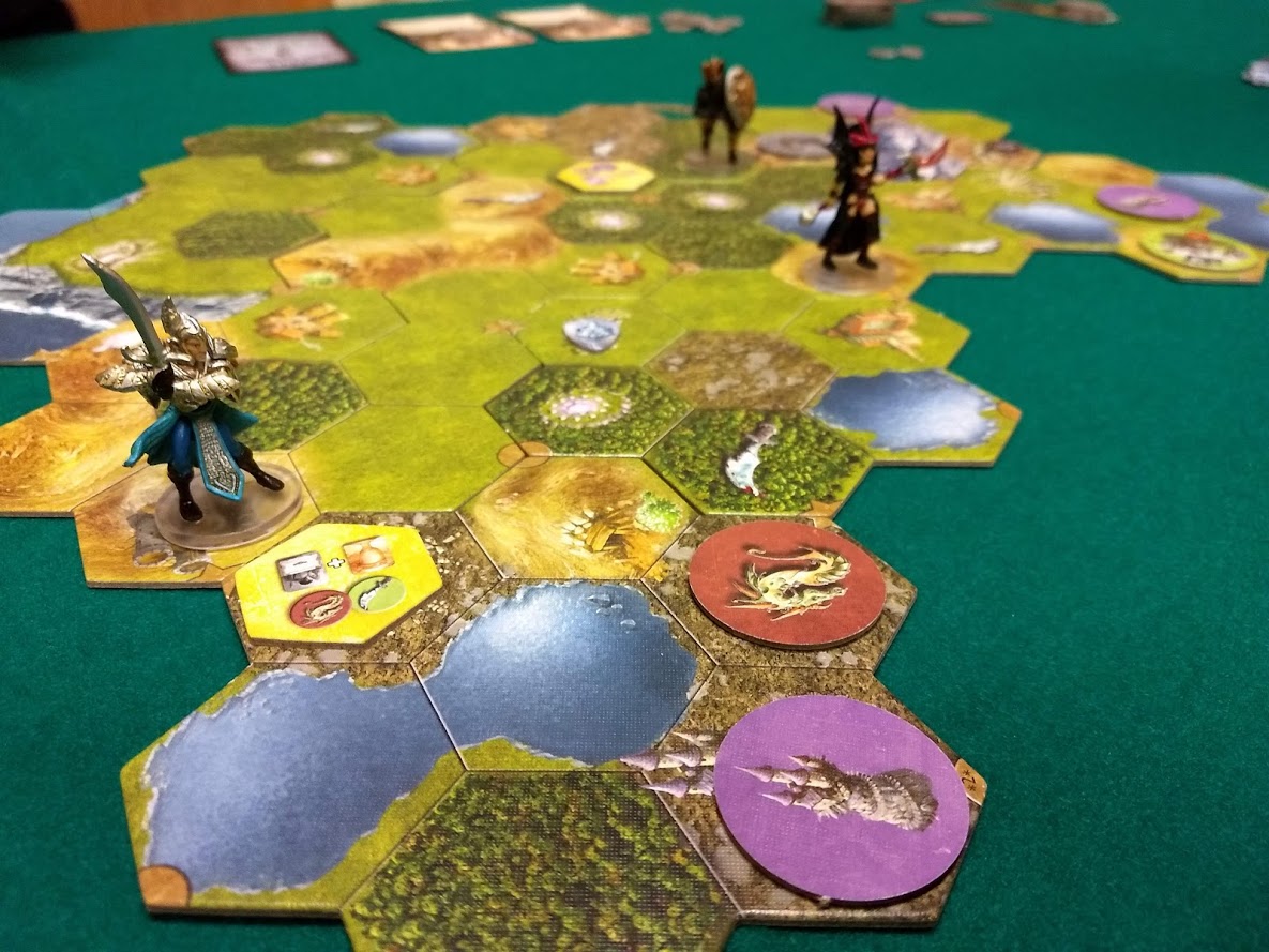 Table 2 et 3, Stéphane a initié Max, Thibault, Yoshi, JP et Fred à Mage Knight, un très gros jeu de notre maître à tous Vlaada Chvatil, lors de deux parties simultanées. Ce jeu est un Heros of Might & Magic en version jeu de plateau : chaque joueur incarne un héros (Mage Knight) et doit découvrir/conquérir un territoire. Le héros avec le plus de points d’expérience gagne la partie.Score final table 2 : Yoshi 53 points, Max 41 points et Thibault 28 points