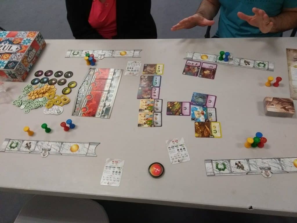 Une première table de 4 curieux, Guillaume, Florence, Marie-Odile et Sylvain 1er ont pu tester la dernière addition à notre ludothèque : « Azul » ! Un jeu abstrait avec un système d’achat, de placement et de résolution de tuiles ; la mécanique est très simple cependant le jeu offre une certaine profondeur stratégique.