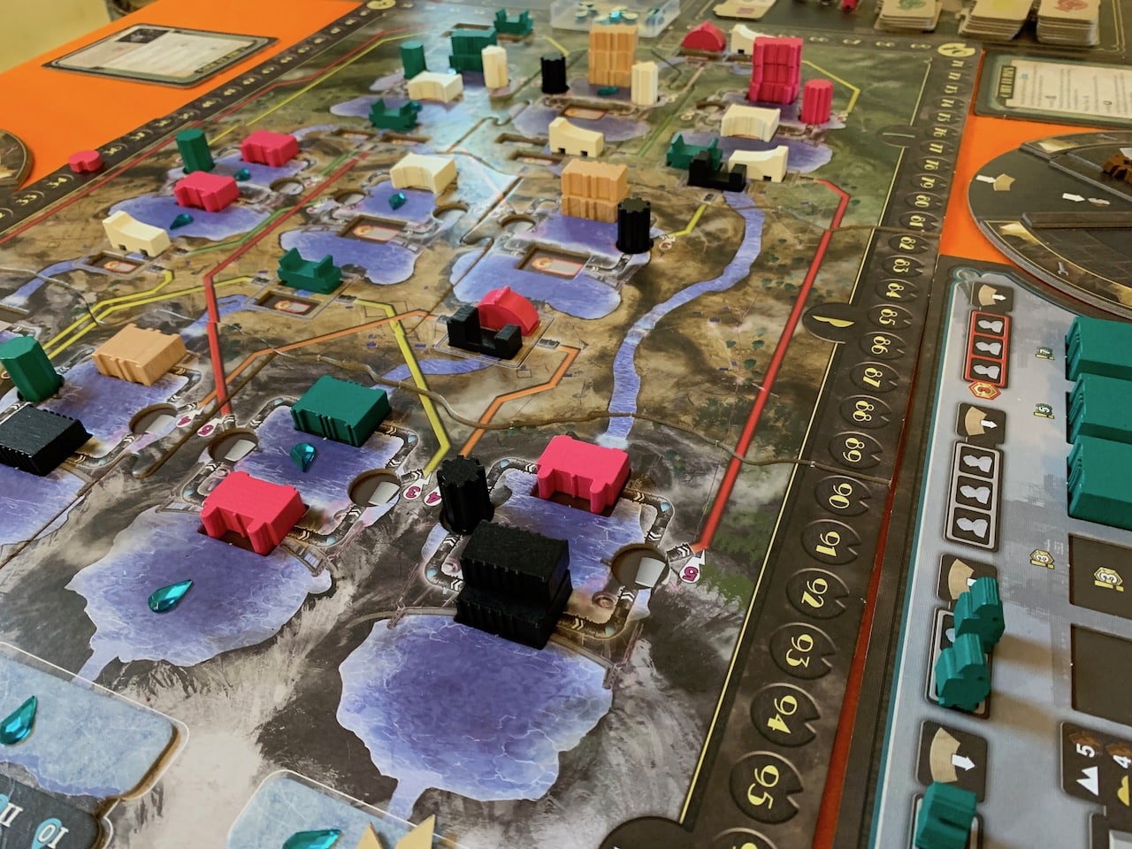 Table rouge : Notre grand classique de l’association, Terraforming Mars, a été mis en place en mode découverte (avec la seule l’extension Prélude) pour trois nouveaux joueurs qui ont ainsi pu explorer cette perle.