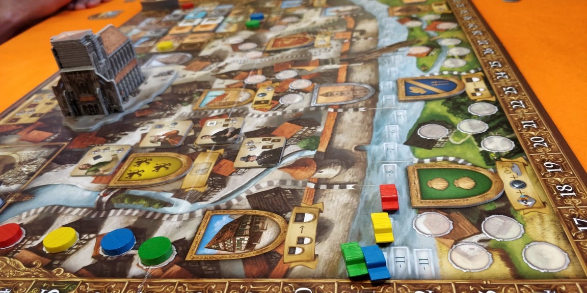 Table jaune : Béatrice, Colin, Émilien et Manu jouent à Brass Birmingham du célèbre Martin Wallace. Un jeu sur la révolution industrielle en Grande Bretagne aux XVIII et XIX siècles avec développements de réseaux fluviaux dans la 1ere phase suivi des chemins de fer.