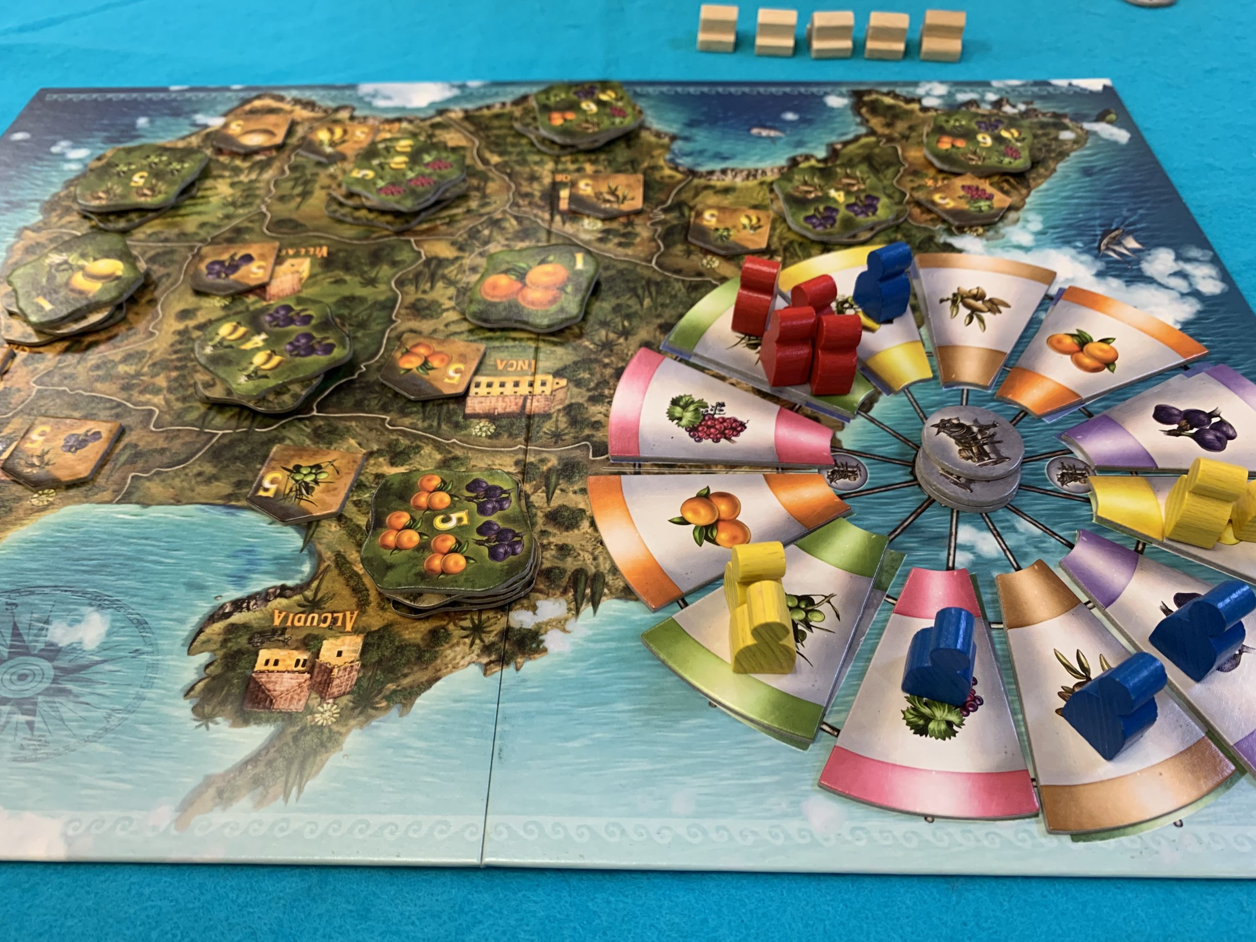 Pour finir la journée, retour sur Terre, et plus précisément à Majorque, avec une partie de Finca. Ici-bas, il s’agit de collecter des fruits pour essayer de satisfaire au mieux la demande des différentes régions de l’île espagnole. Pour récupérer les fruits, le jeu propose une roue dotée d’une mécanique originale. Chaque paysan avance d’autant de cases que de pions présents sur sa case de départ, pour récolter autant de fruits que de pions sur sa case d’arrivée. Par ailleurs, subtilité assez cruelle : dès qu’il n’y a plus assez d’une ressource pour se servir, tous les autres joueurs doivent défausser intégralement la ressource en question. Un jeu où le timing est donc crucial ! Au terme d’une bataille commerciale au couteau, c’est Gauthier D qui a été le maraîcher le plus efficace.