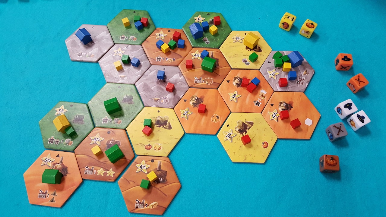 Béatrice, Fred, Manu et Olivier débutent par un Dice Settlers.