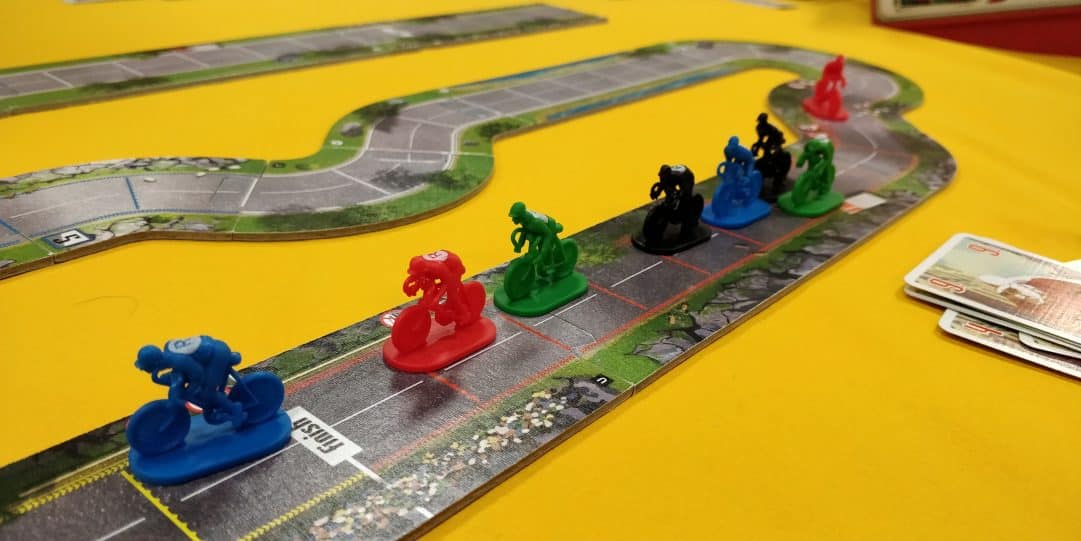 Table Jaune, Florence, Fred, Véronique et Nicolas ont joué à Flamme Rouge. C’est un jeu de course de vélo avec un mécanisme de gestion de deck pour faire avancer ses cyclistes. Un excellent jeu familial nominé aux As d’or 2018.Deux parties, avec une victoire de Florence puis de Fred.