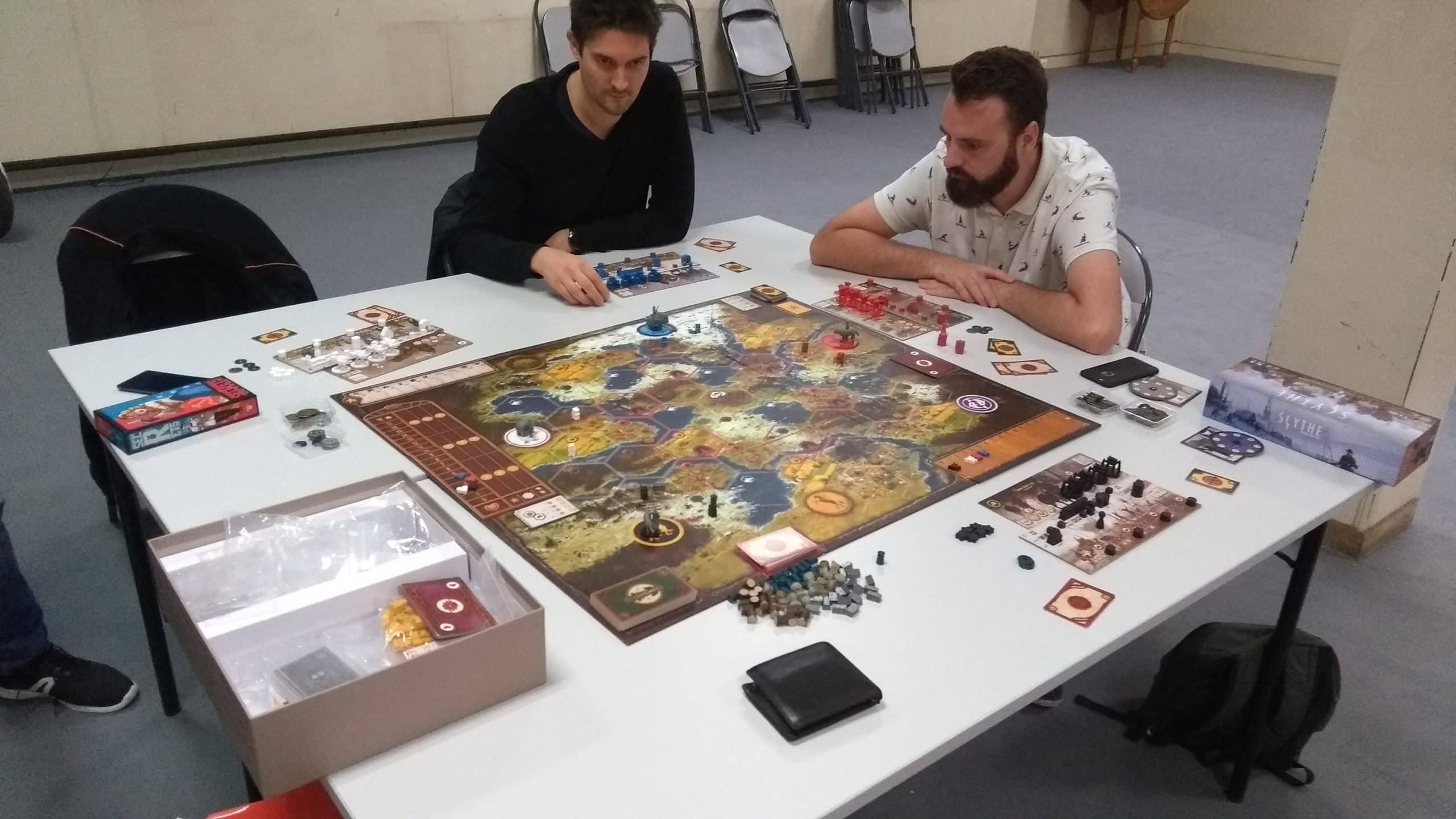 Sur une autre table, Yoshi présentait « Scythe », un jeu de « guerre froide » (gestion de ressources / stratégie) dans un univers alternatif post-première guerre mondiale. Et pour le coup la partie a vraiment été une guerre froide vu qu’aucun combat n’a eu lieu ! (Victoire Yoshi 66 points)