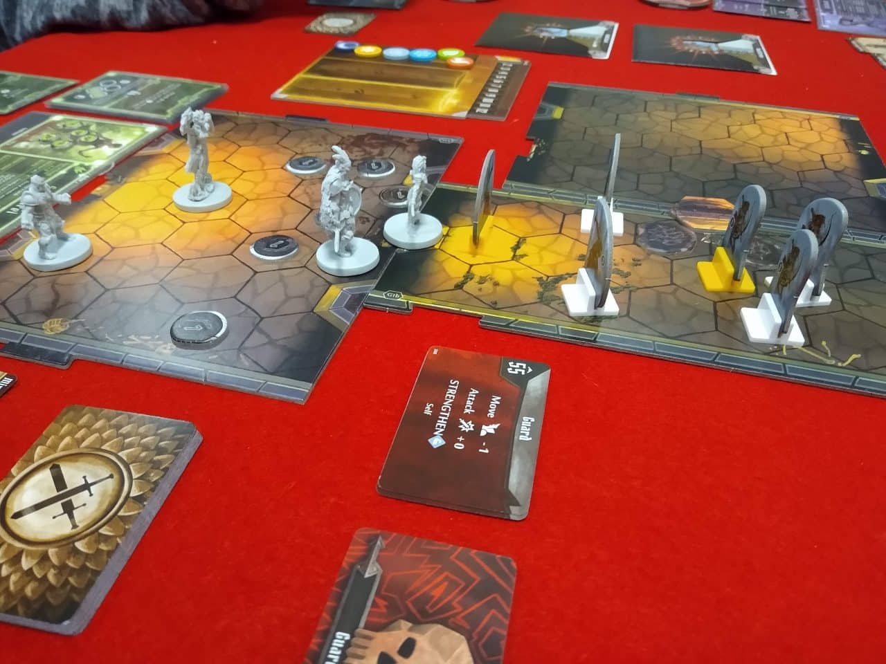 Table Rouge : Johann (la Brute), Vince (le Scoundrel), Émilien (le Spellweaver) et Christophe (le Cragheart) ont pénétré dans le Tertre Noir afin de retrouver les documents de la Valrath Jekserah pour ce premier scénario de GloomHaven.