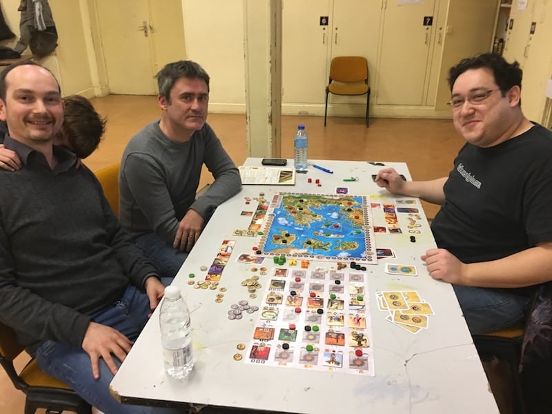Sylvain (Ier), Bertrand et Yoshi sur une partie d’Olympos de 2h. Yoshi qui découvrait le jeu face à deux vétérans d’Olympos a souffert. D’autant plus que le plateau de jeu se réduit drastiquement à trois et les ressources sont rares.