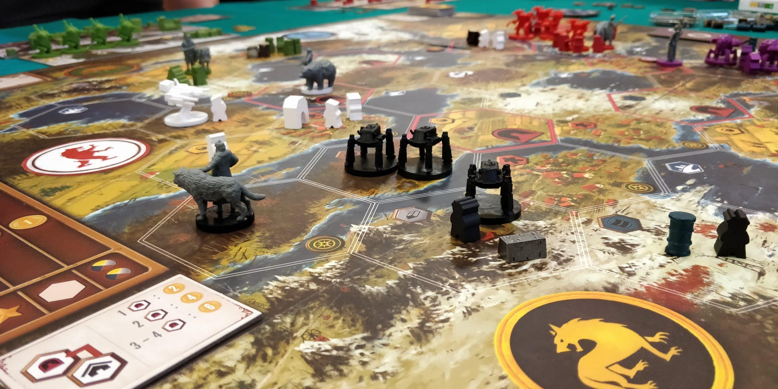 Nous avons fait une partie de Scythe à 6 (ça rime) ! Une partie bien tendue.Score final : Yoshi (Crimea) 71 points, Sylvain (Albion) 71 points, Fred (Saxony) 52 points, Manu (Rusviet) 33 points, Anne (Polonia) 28 points et Luis (Tokugawa) 20 points. Tie breaker 13 structures contre 12 pour Yoshi.