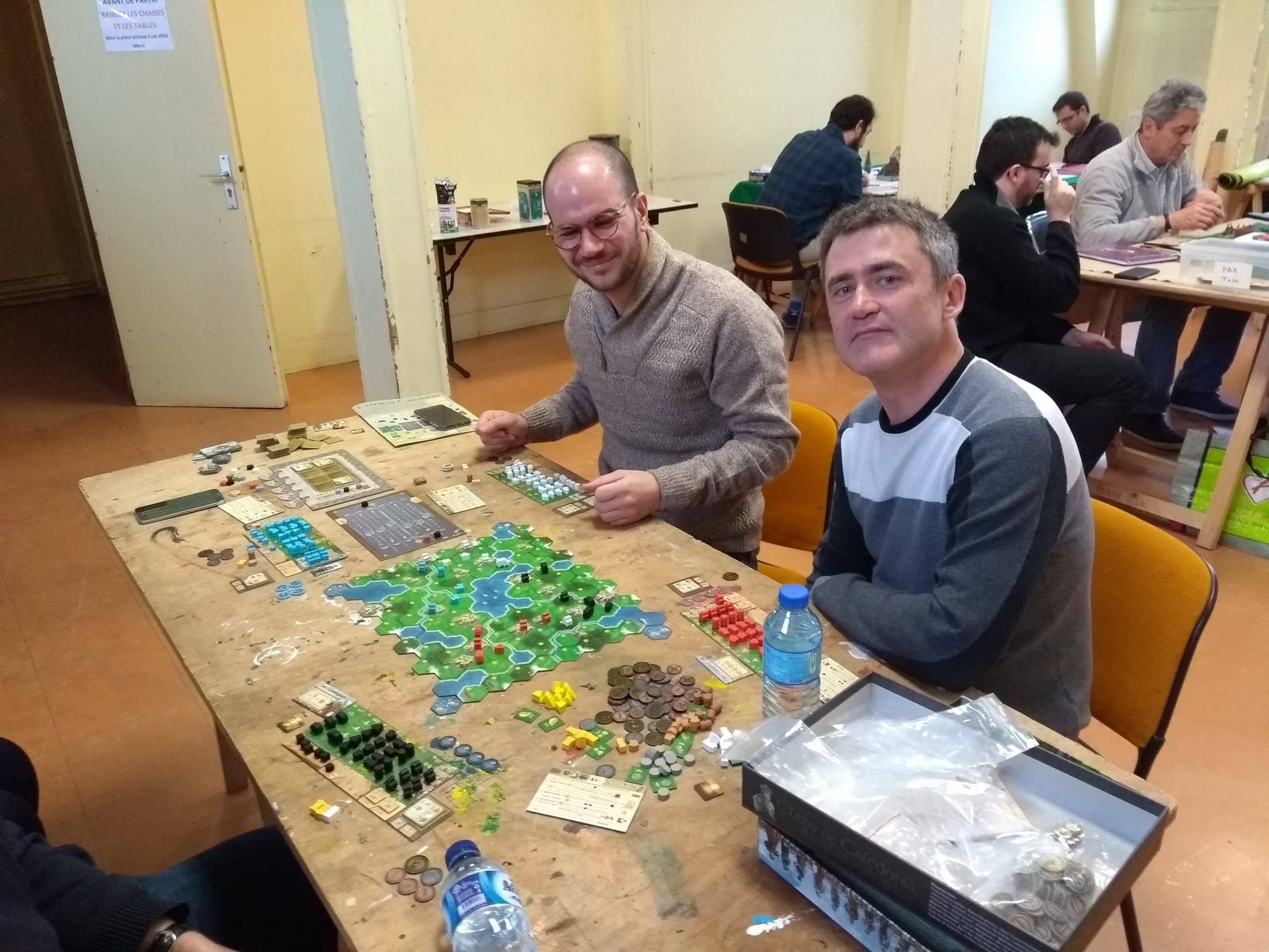 Sur une autre table Sylvain, Christophe, Olivier et Béatrice ont joué à Clans of Caledonia. Un jeu de stratégie et de gestion dans une thématique écossaise, où après d’intensif commerce de moutons et de whisky dans les Highlands, Christophe sera couronné grand vainqueur.