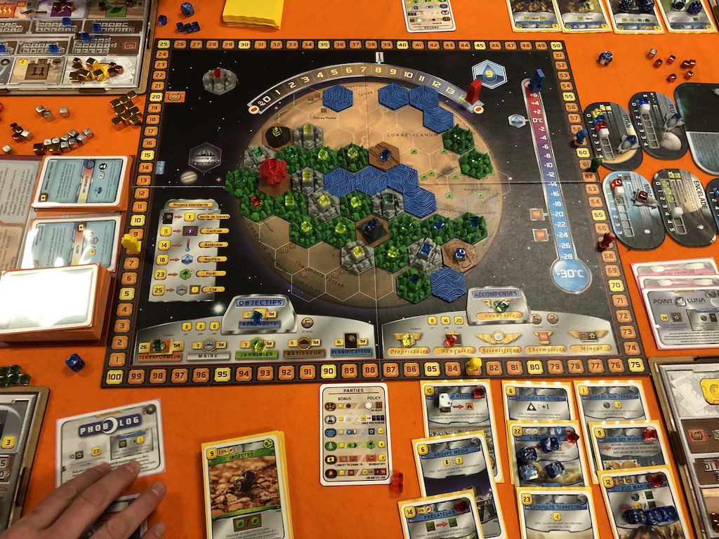 Table rouge, Alexis, Élodie, Dylan et Didier ont joué à Terraforming Mars.