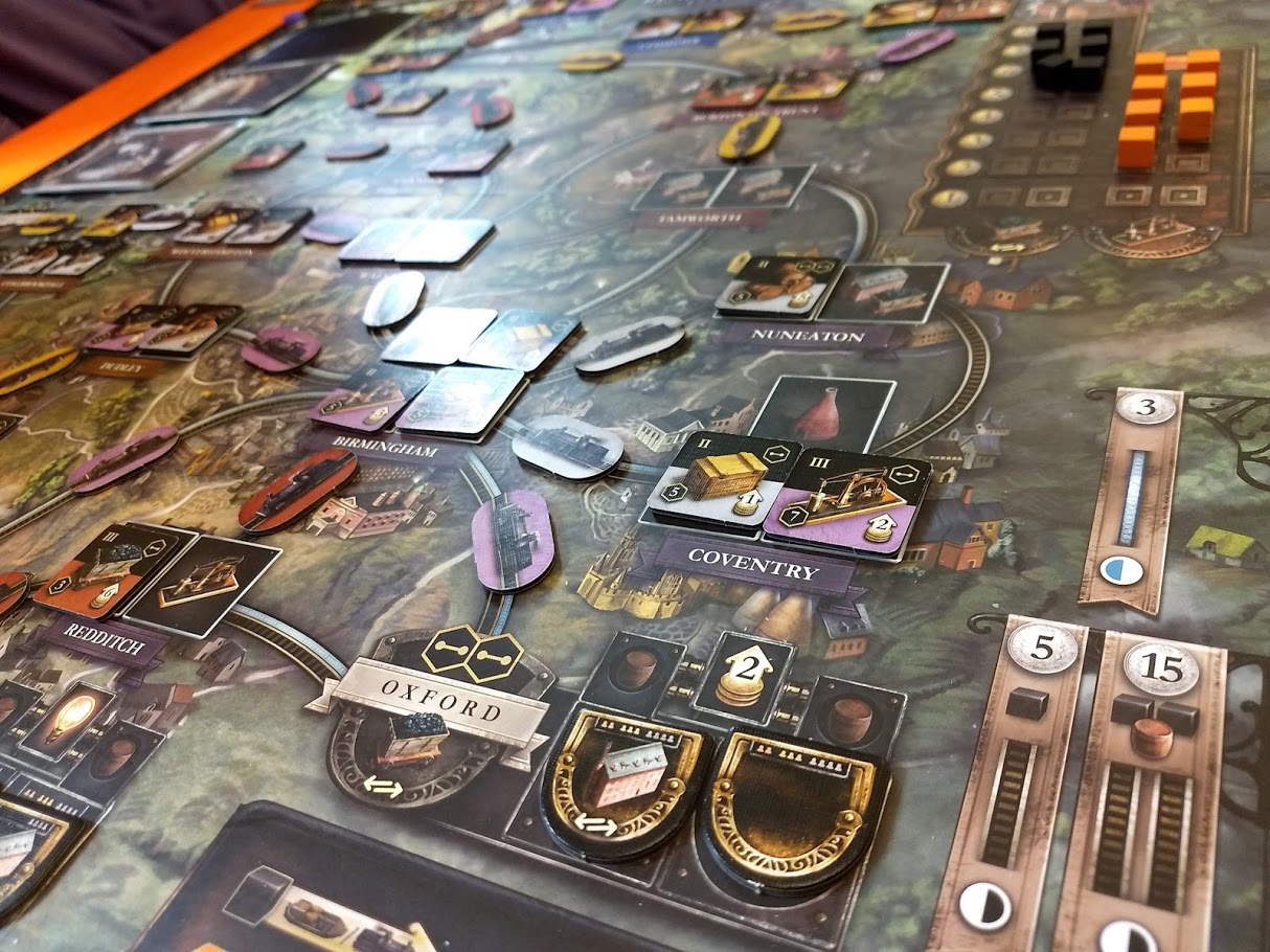 Table orange : Émilien, Thibault, Manu et Yoshi ont joué à Brass Birmingham. Ce jeu est une version alternative du grand classique Brass Lancashire de Martin Wallace. Le principe est similaire, on développe son industrie et son réseau à l’aide de charbon et d’acier durant la révolution industrielle britannique, sauf que dans cette version on « Brass » vraiment car la bière devient une ressource stratégique dans le jeu.
